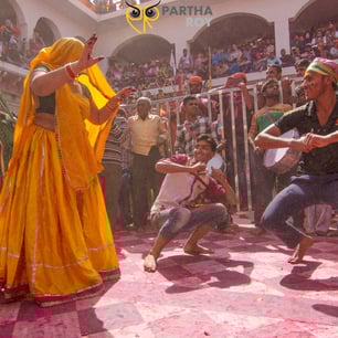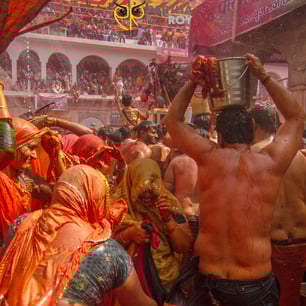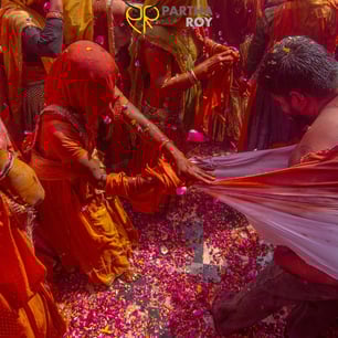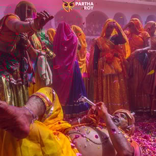 What follows is a playful and symbolic reversal of roles—a celebration of feminine power wrapped in splashes of colour and laughter. The men, having thrown their colours, are swiftly drenched, disarmed, and disrobed of their upper garments. In a spectacle both comic and chaotic, the women use these wet clothes to beat the men in good humour, recreating a scene that is more performance than punishment, more ritual than rivalry.